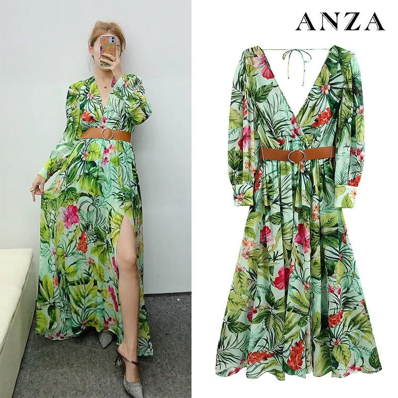 Za 1 1 Women Mididress With Floral Print Belt Long Sleeve Chiffon Dress Femme Summer Green Elegant Loose Casual Shirtdress Dresses Aliexpress