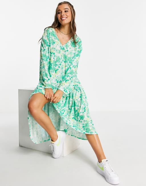 Monki Winnie Long Sleeve Midi Dress In Green Floral Asos